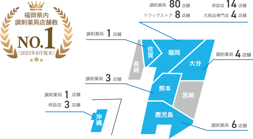 - 121店舗(令和7年12月現在) (調剤薬局95店舗、ドラッグストア調剤併設店14店舗、ドラッグストア8店舗、化粧品専門店4店舗)